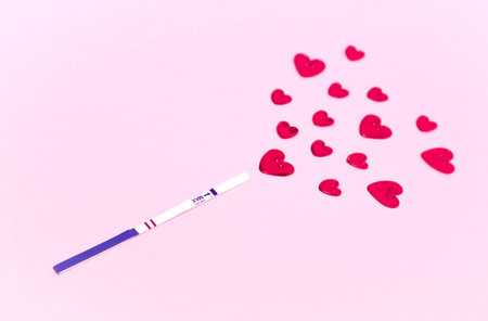 A positive pregnancy test strip and red hearts. The concept of conception, the expectation of a child, a family.