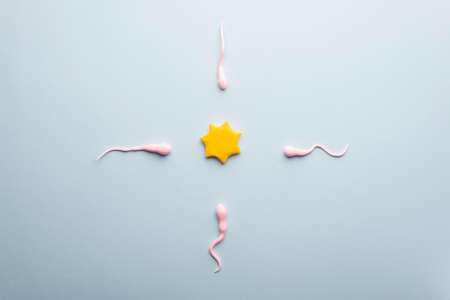 Ovulation, conception, reproductive concept. Spermatozoa with an egg cell on a blue background