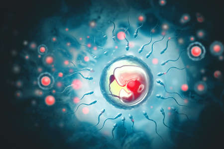 Fertilization of the egg by sperm cells. Pregnancy, infertility treatment, motherhood. 3D illustration, 3D render.