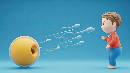 An animated illustration presents a child observing sperm cells approaching a large, yellow egg cell. The image features a bright blue backdrop, and a cartoon style. It could be used in educational material, medical presentations, or illustrations related to biology. The scene features a clean, simple composition suitable for various applications.