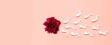 Active sperm cells swim to the egg on a pink background. The concept of pregnancy, fertilization of the egg.