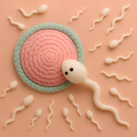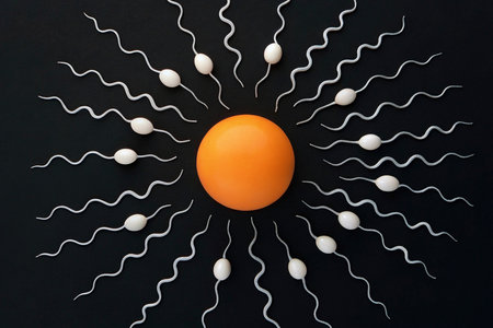 Sperm cell approaching and merging with an egg cell, initiating the process of fertilization, representing human reproduction, infertility treatment, and the beginning of new life