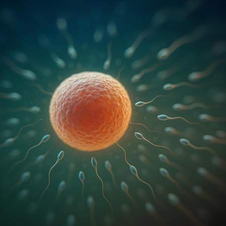 An illustration depicts the process of fertilization, showcasing sperm cells surrounding a central ovum. The image uses a combination of blue and orange hues to highlight the cellular structures and their interaction. This visual representation of biological processes may find applications in scientific, educational, or medical contexts.