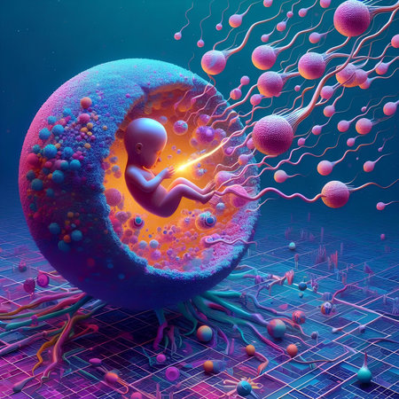 This image depicts a conceptual visualization of the fertilization process. The central focus is a glowing egg cell, surrounded by numerous sperm cells. The style is digital, using a dark background with light effects to create depth. It can be used in educational materials, scientific publications, and marketing visuals.
