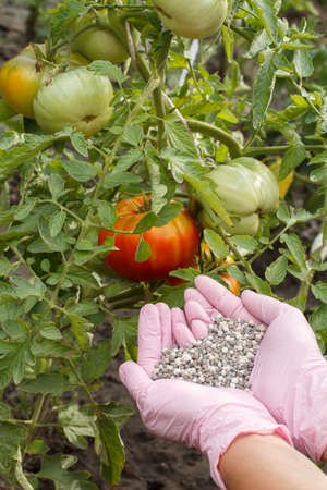 Farmer hands in rubber gloves holds chemical fertilizer to give it to tomato bushes in the garden.