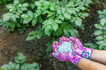 Farmer hands in rubber gloves hold chemical fertilizer to give it to potato bushes in the garden.