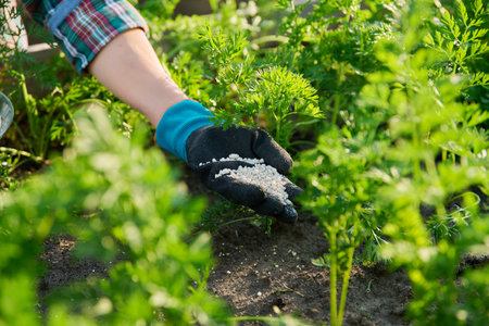 Close up of mineral fertilizers in hands, fertilizing carrot plant