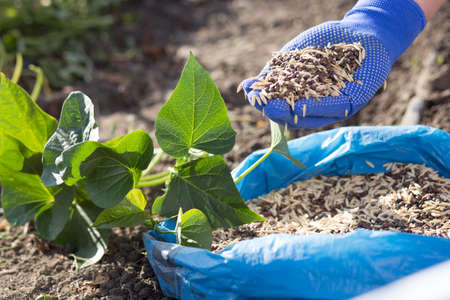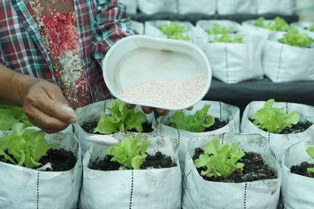 Closeup gardener is fertilizing salad vegetables in white sacks by using organic fertilizer from smashed eggshells. Concept, organic gardening, using food scraps waste to be fertil