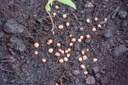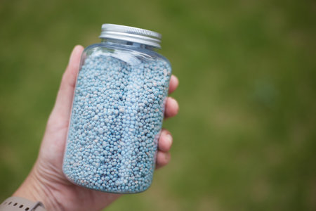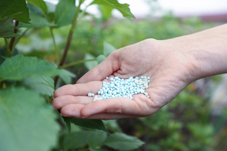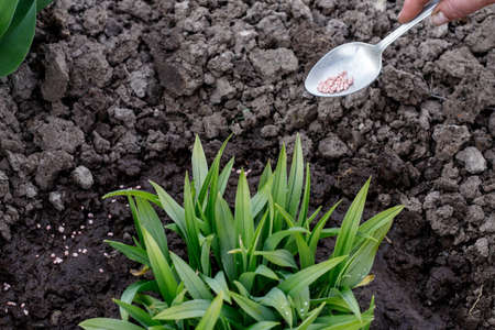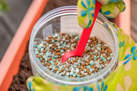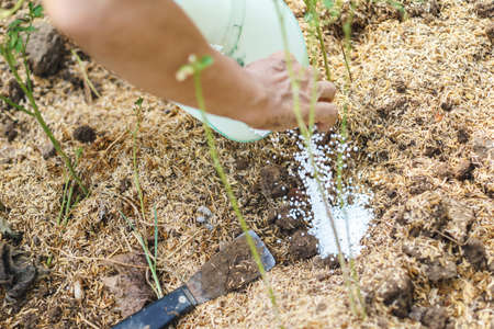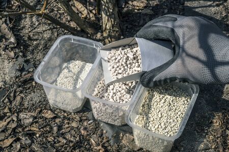 Fertilizing the garden by bio granular fertilizer for better conditions of garden, gardening concept