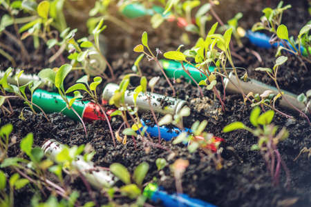 Used alkaline batteries lie in the soil where plants grow. The concept of environmental pollution with toxic household waste