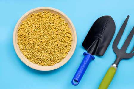 Chemical plant fertilizer on pottery plate with garden shovel and fork on blue background. Top view