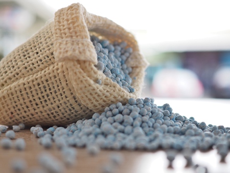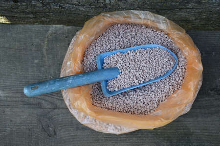 Old chemical fertilizer until the pellets start to break in the sack on the old wood board.