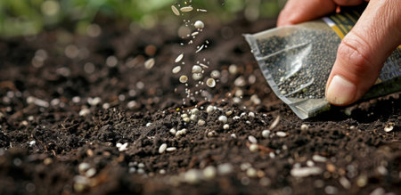A hand sprinkling wildflower seeds from a packet onto a patch of soil