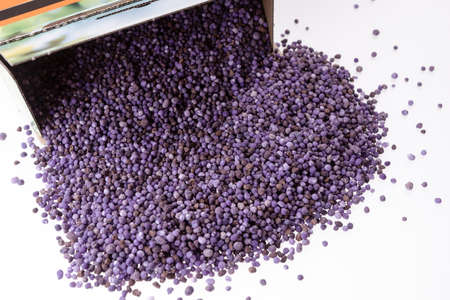 Purple mineral fertilizer for the lawn in the garden isolated on white background