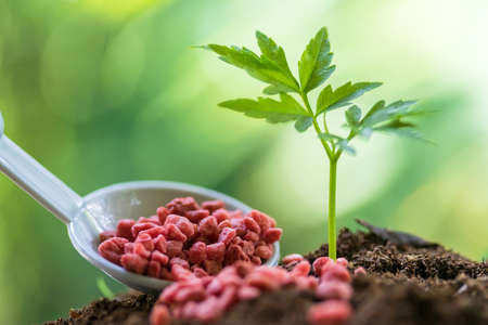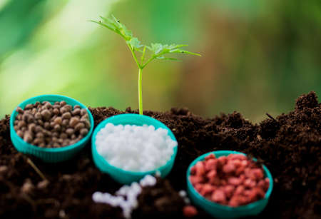 Fertilizer plant food to soil ground for vegetable tree sprout seedling and flower garden, Fertilizer and agriculture industry and take care of plants concept