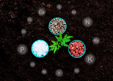 fertilizer in soil. The concept of plant care is the need for feeding with various fertilizers. Text N, P, K