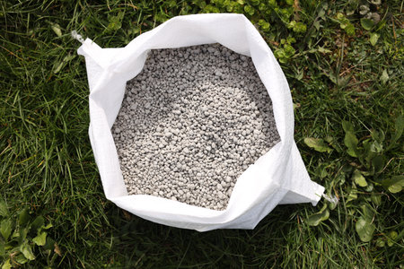 A white bag with fertilizers in close-up against the background of seedlings on an earthen bed. Background. Selective focus
