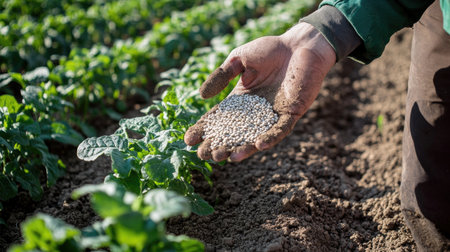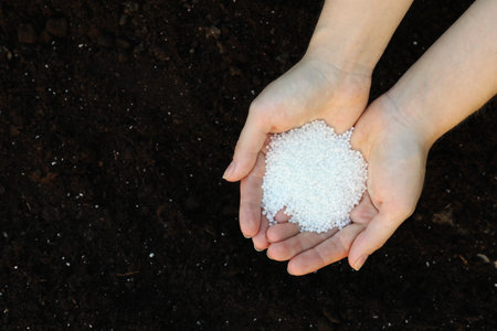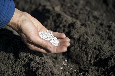 The hand of a woman farmer holding a handful of white fertilizer granules on the background of an Earth bed with already applied fertilizers. Background.