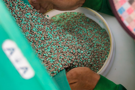 Blue latex Glove ,Chemical Fertilizer in researcher hand, to research on nutrient and fertilizer management.