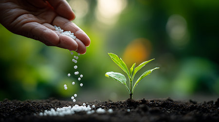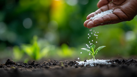 A close-up shot shows a hand fertilizing a small green plant seedling. White granules are being scattered onto dark soil, promoting growth. Green bokeh background.