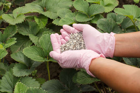 Farmer hands in rubber gloves holds chemical fertilizer to give it to strawberry bushes in the garden.