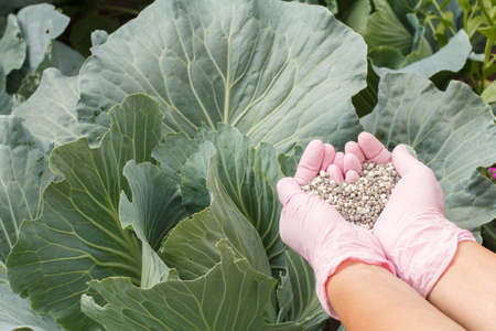Farmer hands in nitrile gloves holding chemical fertilizer to give it to a green cabbage in the garden.