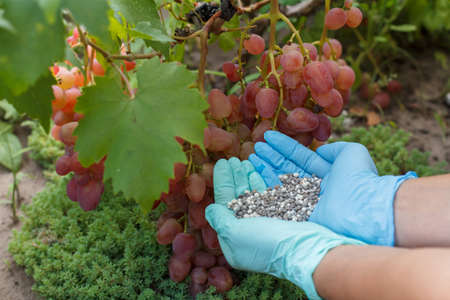 Farmer hands in rubber gloves holds chemical fertilizer to give it to red grapes in the garden.