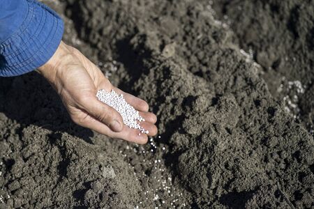 The hand of a woman farmer scatters a handful of white fertilizer granules on the background of an earthen bed with fertilizer. Background.
