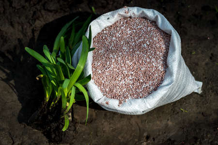 A bag of fertilizers close-up with green onion seedlings on the background of an earthen bed. Background. Top view. The concept of stimulating plant growth with fertilizers