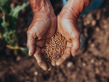 Farmer applying fertilizer in vibrant garden during sunny day to enhance plant growth