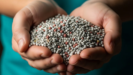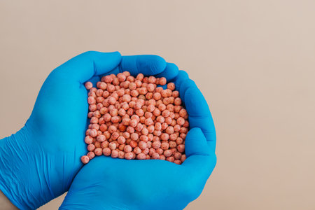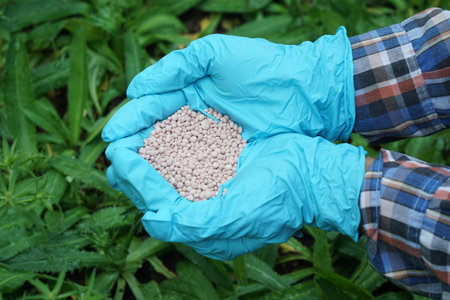 Farmer holding granular NPK soil fertilizer in hand, closeup with selective focus
