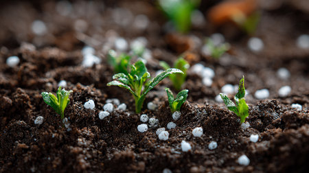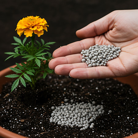 Close-up shot showing a hand fertilizing a young plant in the soil with granular fertilizer. White pellets are being poured onto the seedling, which is growing in rich, dark earth.