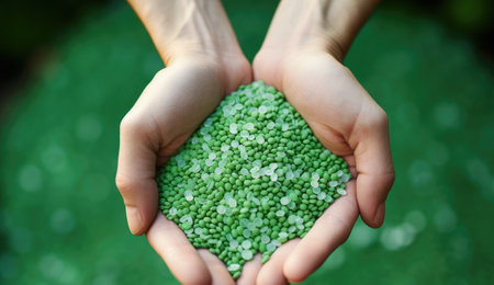 Hands touch clear green plastic dye granules, biodegradable pellets.