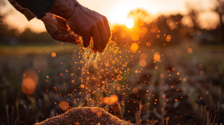 farmer pouring grains into a sack, in the background a sunset generative ai