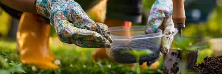 Eco friendly gardening banner. Woman preparing soil for planting, fertilizing with compressed chicken manure pellets. Organic soil fertiliser.