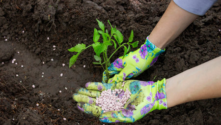 Fertilizing plants in a spring garden with chemical mineral graduated fertilizers