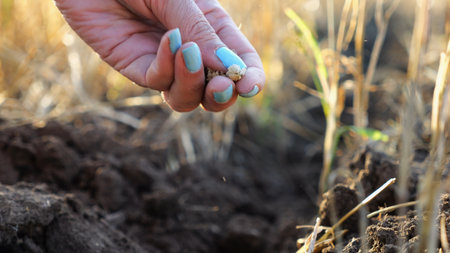 Early morning gardening, hand dropping corn seed into fresh soil