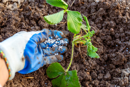 Farmer giving granulated fertilizer to young strawberry plants. Hand fertilize organic garden.Blooming strawberries