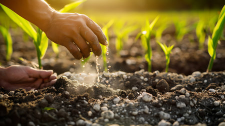 hand of a farmer giving fertilizer to young green plants nurturing baby plant with chemical fertilizer