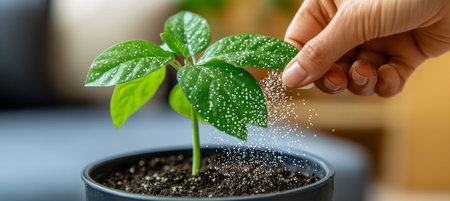 A close-up shot shows a hand fertilizing a small green plant seedling. White granules are being scattered onto dark soil, promoting growth. Green bokeh background.