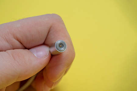 A prefabricated USB cable in your hand on a yellow background. Modern and convenient means for charging gadgets
