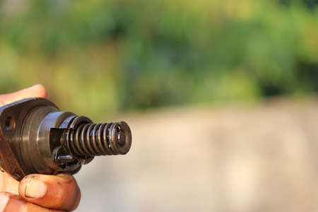 Close view of Spring and other parts of diesel fuel injector held in the hand