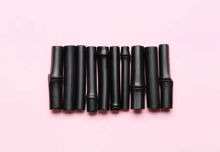Natural activated bamboo charcoal on concrete background. Realistic pieces charcoal.