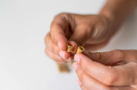 Hand of Caucasian teenager boy with haw stump in fingers.
