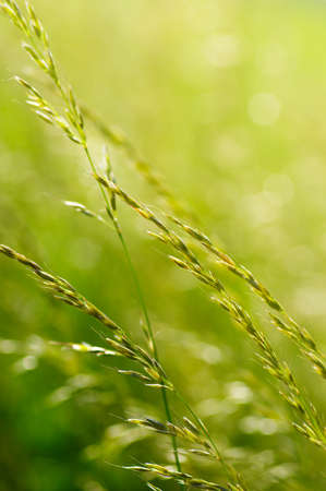 Wild green grasses in the morning sunlight. Macro image. Beautiful summer nature background