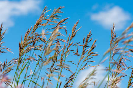 Meadow fescue (Festuca partensis) on a bright sunny day. Close-up