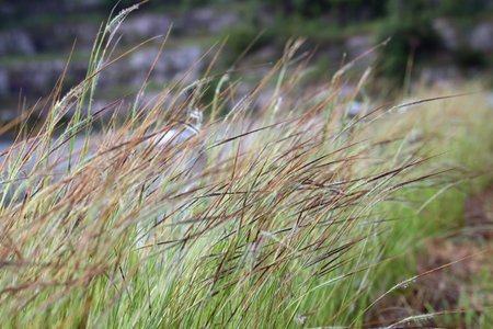 Soft, feathery grass blades dance gracefully against a blurred green backdrop, capturing the essence of tranquility. This serene image evokes a sense of calm and connection to nature, inviting viewers to pause and appreciate the beauty of the outdoors.