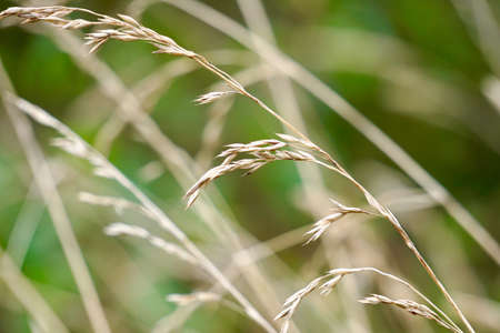 Yellow dry ears of grass cereals on the green forest background close-up view