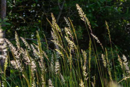 Calamagrostis epigejos also known as bushgrass flourishes in a forest setting as sunlight highlights its tall slender stems and feathery flower heads.