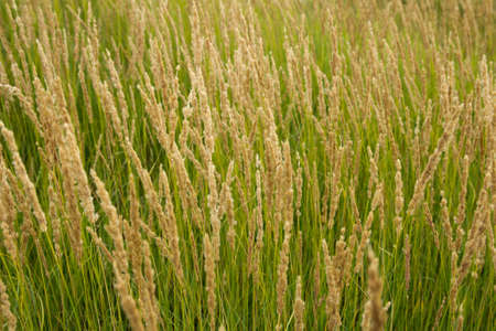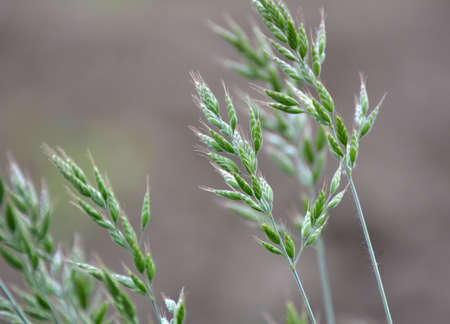 Green grass with flowering racemes of ears in a uniform soft light. Natural background.